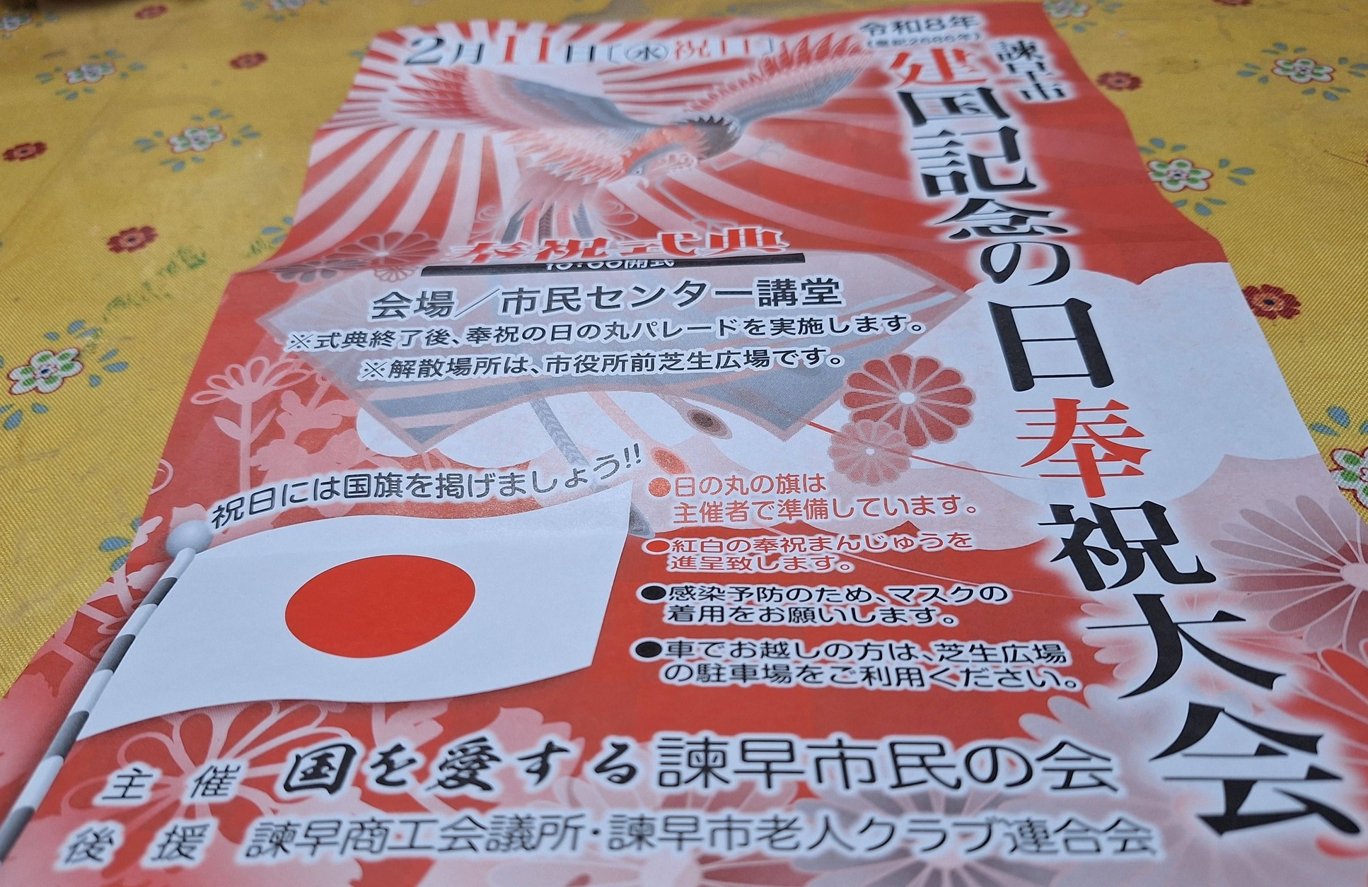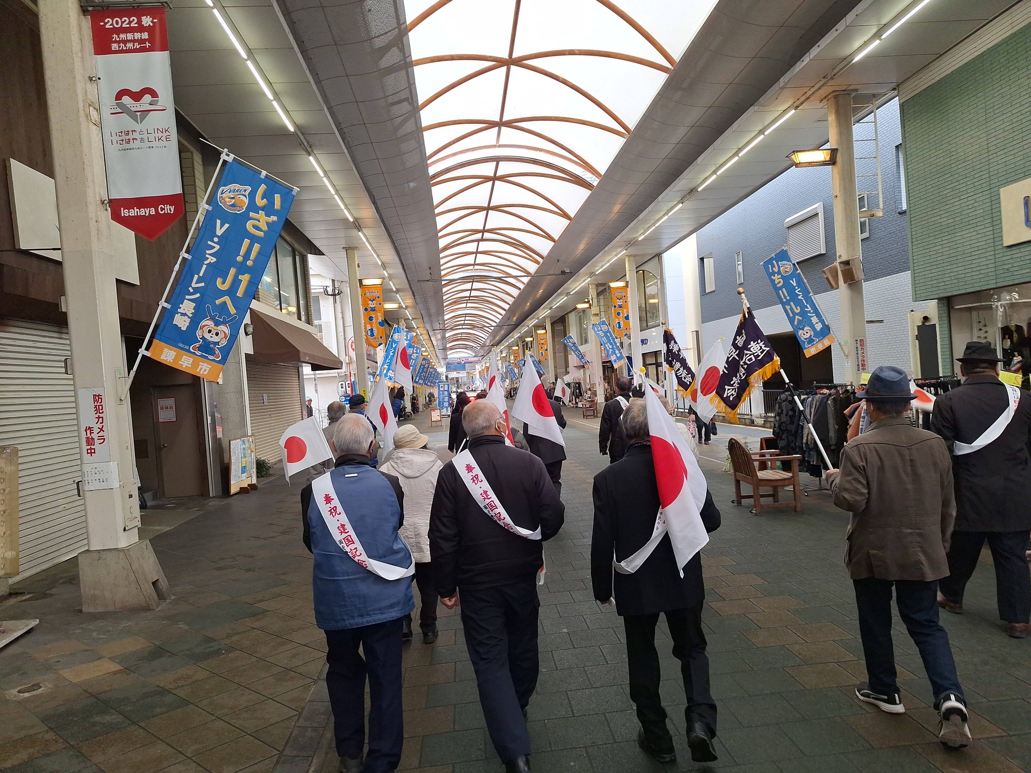 その後日の丸パレードで市民センタ―からア―ケ―ドを1周し市役所前広場で万歳三唱で締めくくり、紅白饅頭が配布され、皇紀2686年の奉祝大会を終了しました。